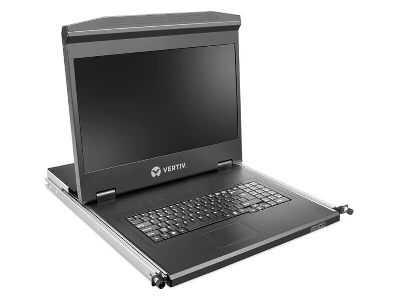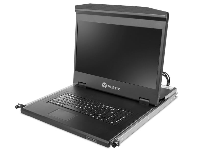 The Vertiv™ Local Rack Access LCD console integrates an 18.5" monitor, keyboard and touchpad mouse. It has two USB 2.0 compliant pass-through ports, which provide faster data transmission between your console and connected devices.