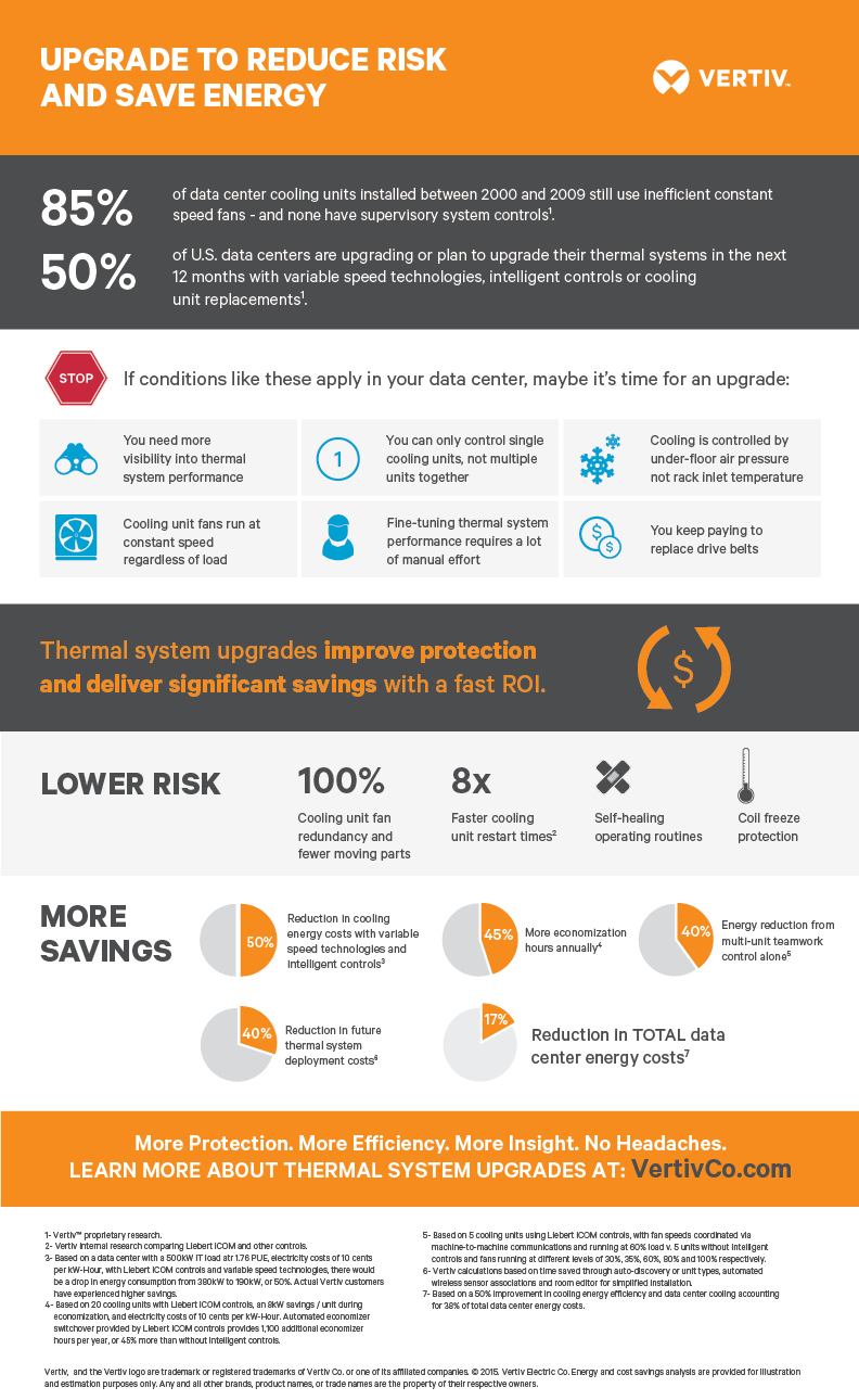 {"IsDifferent":true,"HomePageUrl":null,"PageDoesNotExist":false,"UrlForCurrentLanguage":"/en-us/about/news-and-insights/articles/infographics/upgrade-to-reduce-risk-and-save-energy/","IsStartPage":false,"CountryCode":"ESP","LanguageCode":"es"} × Estado de activación Se ha restringido el acceso a este enlace desde su cuenta.Contacte con la asistencia para partners de Vertiv: salescloudsupport@vertivco.com Menu Open search modal US/ES Guardar The page you're viewing is for Spanish (EMEA) region. Proceed STAY IN MY REGION Contacto Investors Iniciar sesión Correo electrónico Contraseña Show password ¿Olvidó su contraseña? Iniciar sesión Crear una cuenta Soporte Resources & Documentation Product Documentation Quality Policy & Certifications Software/Firmware Updates Register your Product Tools & Applications Discontinued Products Training Product Overview Product Service Product Operation Type search term here {{keyword}} Search The page you're viewing is for Spanish (EMEA) region. Proceed STAY IN MY REGION 关于 洞察 Upgrade To Reduce Risk And Save Energy Upgrade To Reduce Risk And Save Energy octubre 07, 2016 Infografías Centro de datos/Colocation/Hosting Optimización de instalaciones Thermal Management Thermal system upgrades improve protection and deliver significant savings with a fast ROI. View Full Infographic Artículos relacionados Temas de artículos Visit the Colocation Exchange Infografías Thermal System Upgrades: Higher Reliability And Efficiency Temas de artículos Small Room Cooling