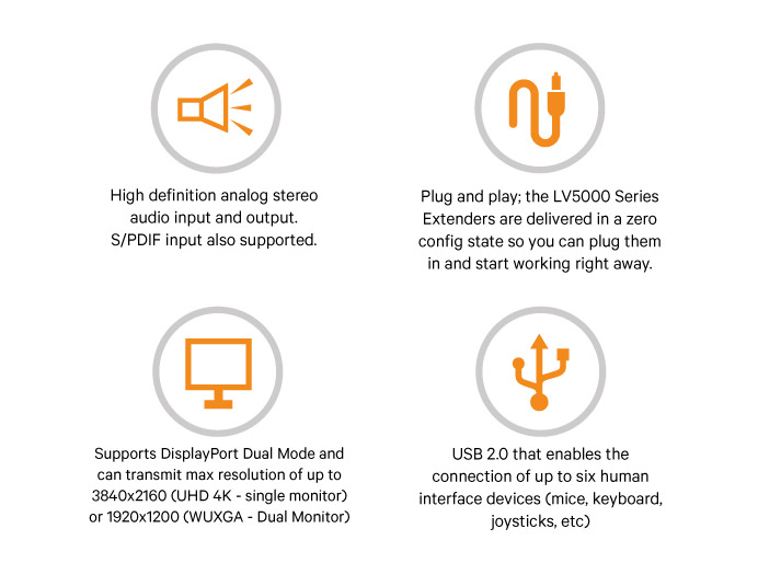 Vertiv Avocent LV5000桌面工作站用于连接用户端的键盘、鼠标、显示器(单/双DP)、音频和麦克风供用户进行操作访问。接收端和发送端设备之间通过单/两根网线连接,最大可以支持150米(1000英尺),具备本地显示器口,最大分辨率支持1920*1200,支持USB透传。